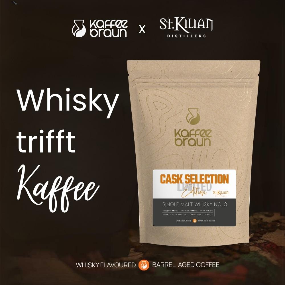 Unser Single Malt Whisky Kaffee No. 3 setzt die Reise unserer Cask Selection konsequent fort – mit noch mehr Reife, Tiefe und Charakter. Erneut entsteht dieses exklusive Projekt in Zusammenarbeit mit den St. Kilian Distillers aus Unterfranken, die für authentischen Single Malt Whisky „Made in Germany“ stehen – geprägt von schottischer Tradition, modernem Fassmanagement und echter Handwerkskunst.