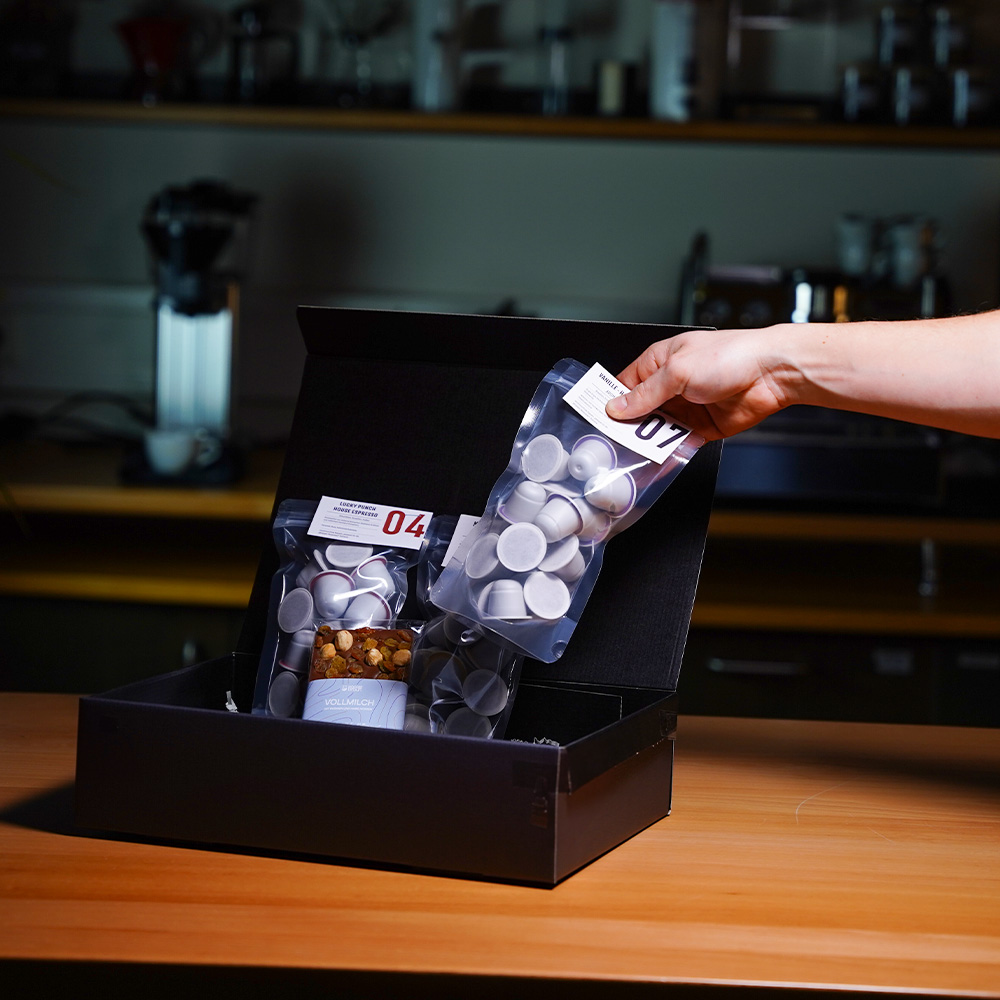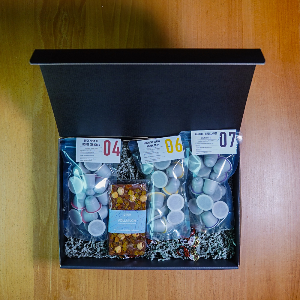 Drei sorgfältig ausgewählte Kapselsorten, kombiniert mit süßen Highlights wie Vollmilchschokolade und Kaffeebonbons, liebevoll verpackt im anthrazitfarbenen Geschenkkarton – perfekt zum Verschenken oder selbst Genießen.