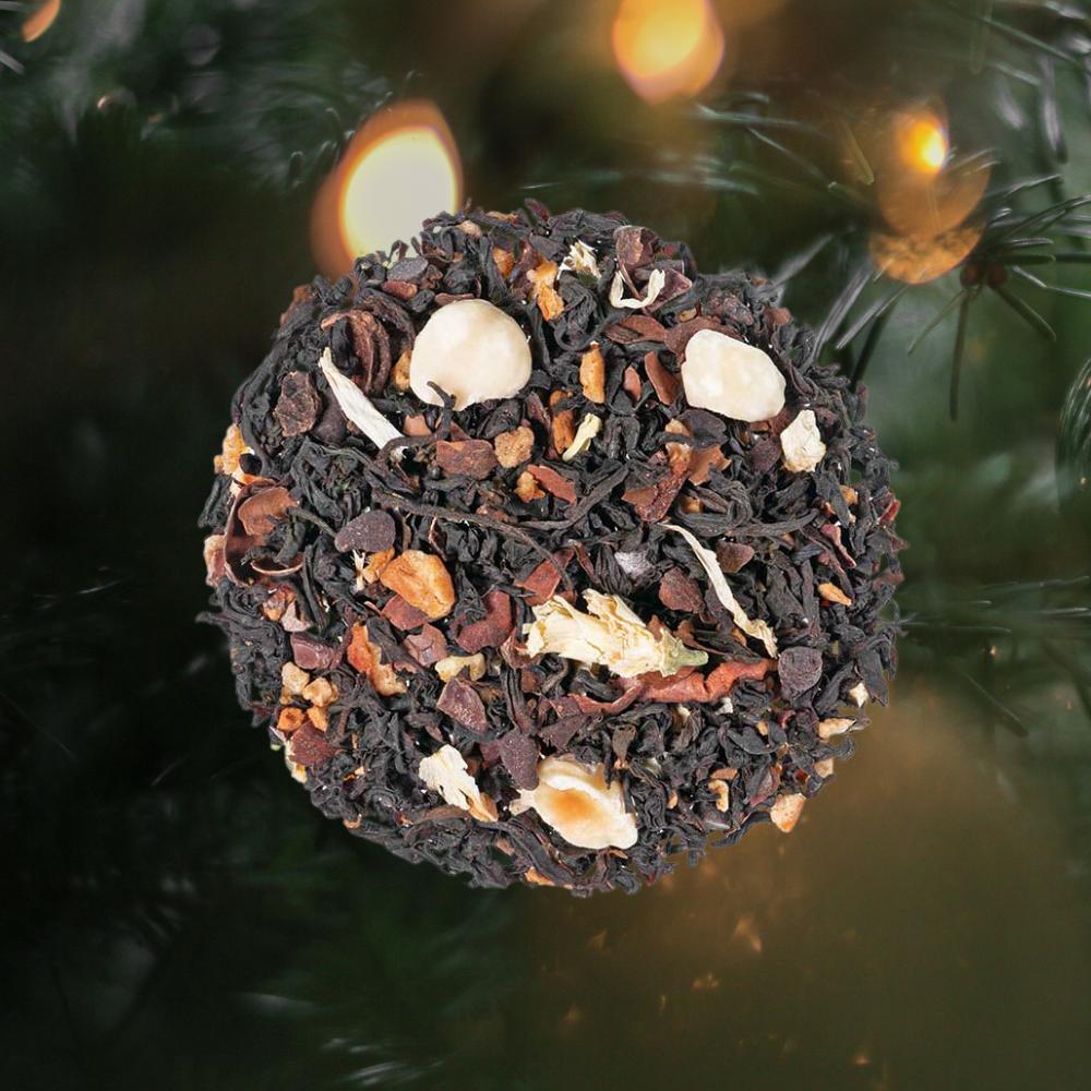 Schwarzer Tee, Apfelstücke, Kakaoschalen(9%), Aroma, Krokantstücke (Zucker, Haselnüsse), Schokostücke (Zucker, Kakaomasse, Kakaopulver stark entölt, Kakaobutter, Dextrose, Emulgator: Lecithin), Kakaostücke(4%), Haselnussstücke(2%), weiße Hibiskusblüten
